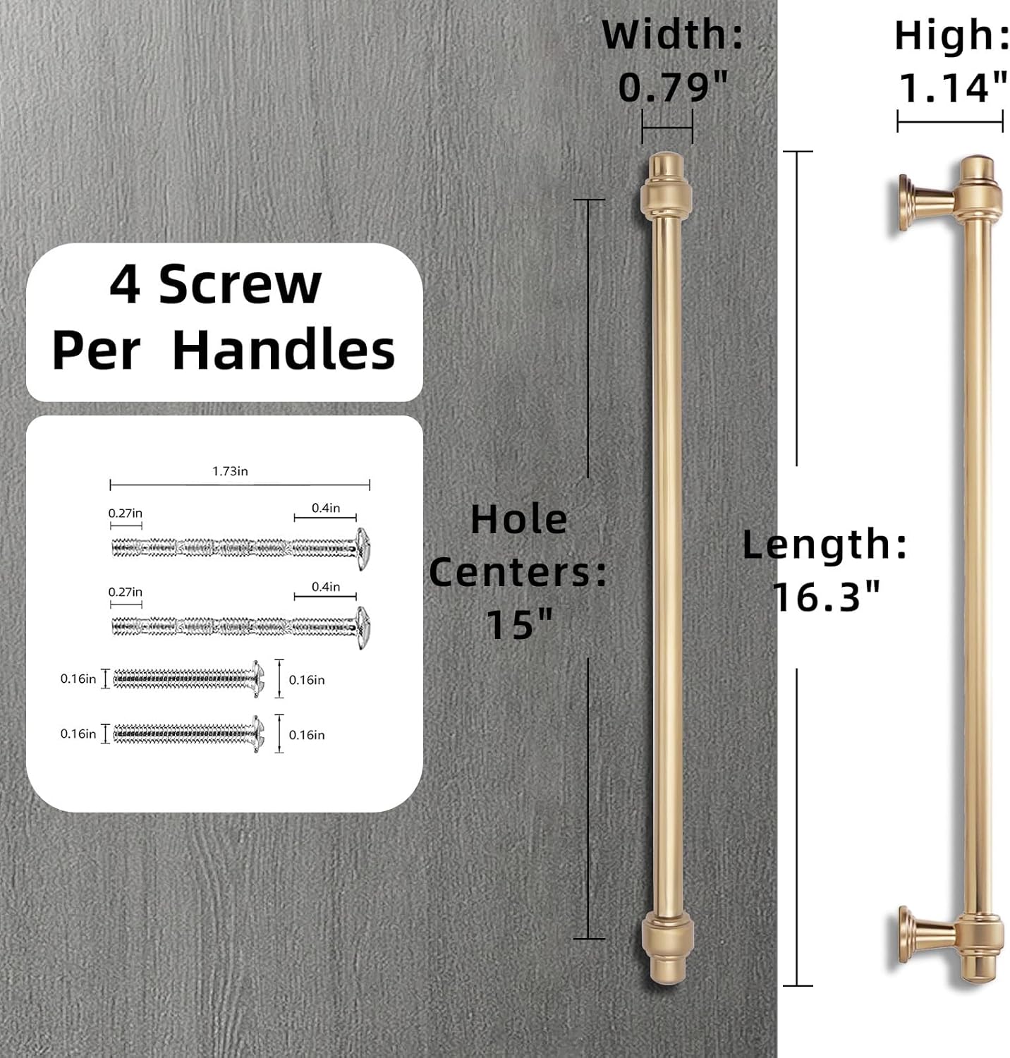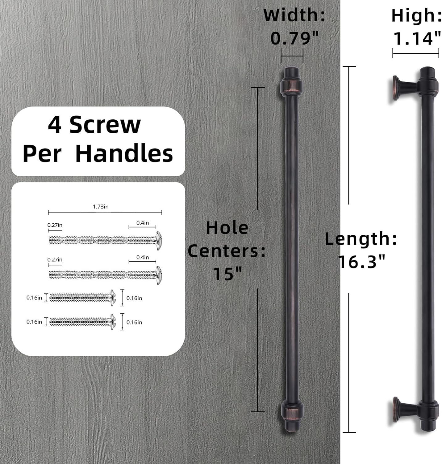 • SIZE: Hole Center: 6-1/4 inches (160MM); Overall Length: 7.5 inches (193MM); Width: 0.78 inches (20MM); High: 1.4 inches (36MM); Please double check the size of the pull you need before purchasing.Each pull handle includes two 1.1-inch and two 1.73-inch screws.